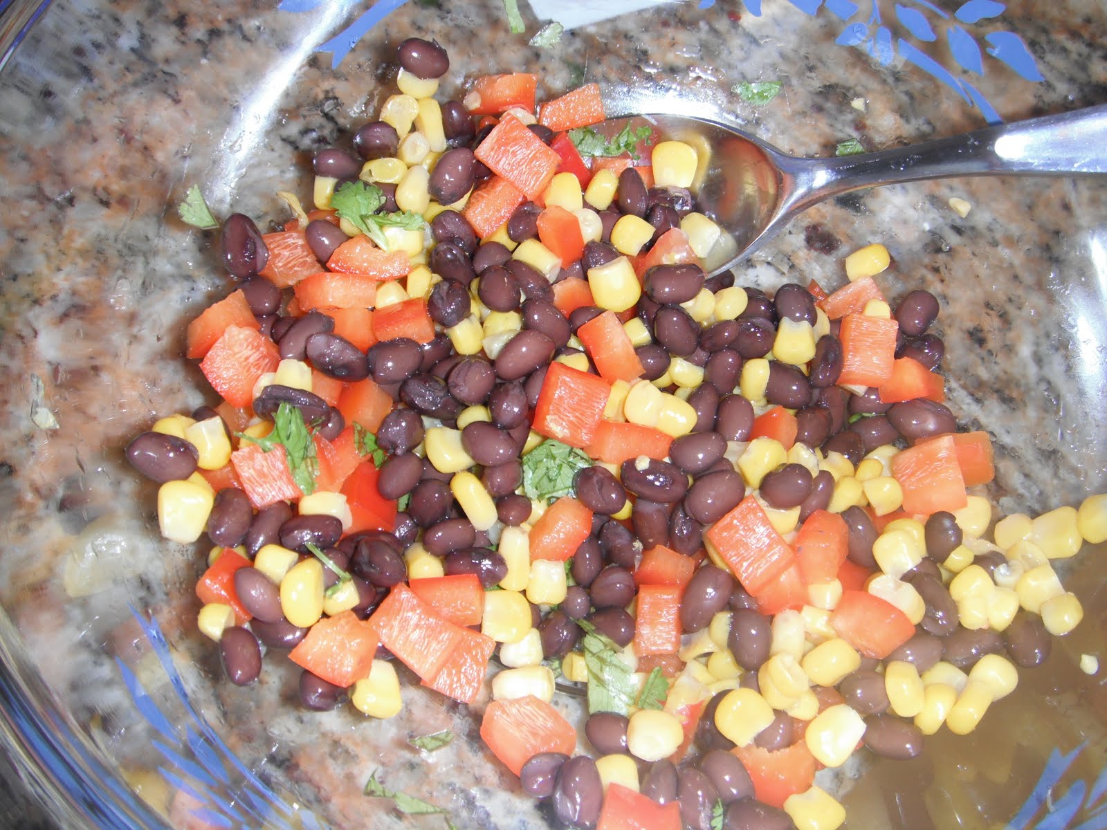 I drained and rinsed the corn and black beans. Then diced the red pepper and cilantro and mixed it all up in a bowl ahead of time. I added the mixture to the salad and tossed with the salad dressing. I wish I had some tortilla chips in the house to add for crunch but was still delicious anyway. After our healthy dinner we are ready to watch Biggest Loser!